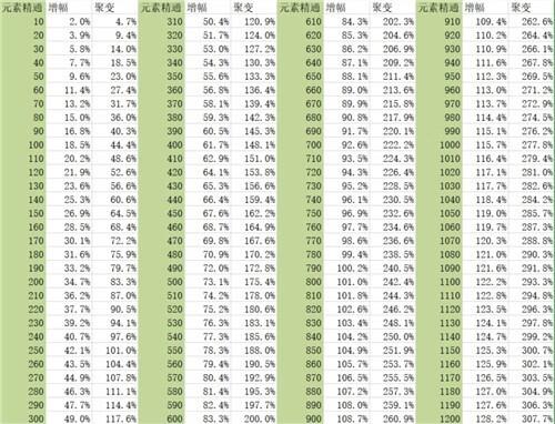 首先这里整理了一个“聚变”(扩散)反应的元素精通增伤表