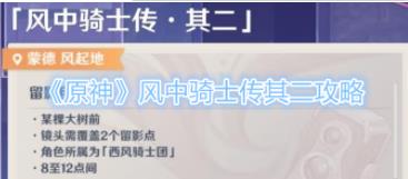 各位小伙伴们大家好呀,众所周知,在新版本中原神新增了不少新内容,而风中骑士传是画外旅照是第一天的任务,而下面小小编小编将要为大家带来了原神风中骑士传其二攻略,对此感兴趣的小伙伴可以跟随小小编小编一起来看看。