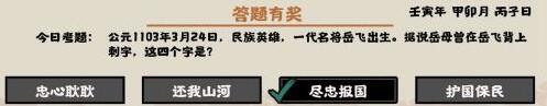 《无悔华夏》的游戏过程中,有个答题的活动,答对之后就有奖励,很多都是知名的历史人物的铭文轶事,对大家了解历史是很有帮助的,其中我们说的是岳飞背后的刺字,是岳母给他刺的,就是“精忠报国”