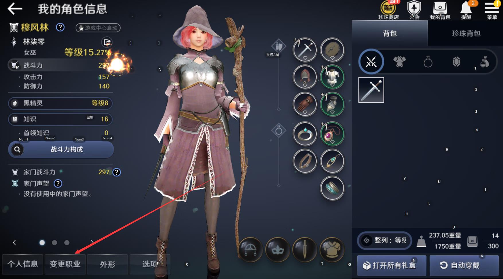 1、在游戏中点击我们需要进行变更执业的角色,进入角色页面,点击左下角的变更职业。