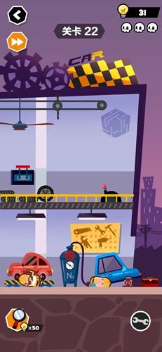 这一关先点击右下角的工具箱得到扳手,用扳手拧车轮,再打开充气机,站车旁边的人就GG了,然后我们点击上面的轮胎,散开后露出里面的风扇开关,往上打开风扇,再控制右边的把手,把吊车机移到左边,然后吊绳就会被切断,汽车就会掉下来,砸倒修车的人。