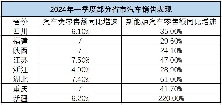 今年一季度,新能源零售额显著增长,也在各省经济报告中单独提列。不少省市的同比增长都在 25% 以上,湖北的增速甚至达到了 61%。新疆一季度的新能源汽车零售额直接同比增长了 2.2 倍,非常迅猛。