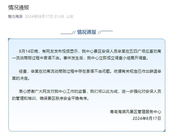 8 月 14 日晚,有网友发布视频显示,我中心景区安保人员辛某在五四广场巡查劝离一流动商贩过程中言语不当。事件发生后,我中心立即成立调查小组展开调查。