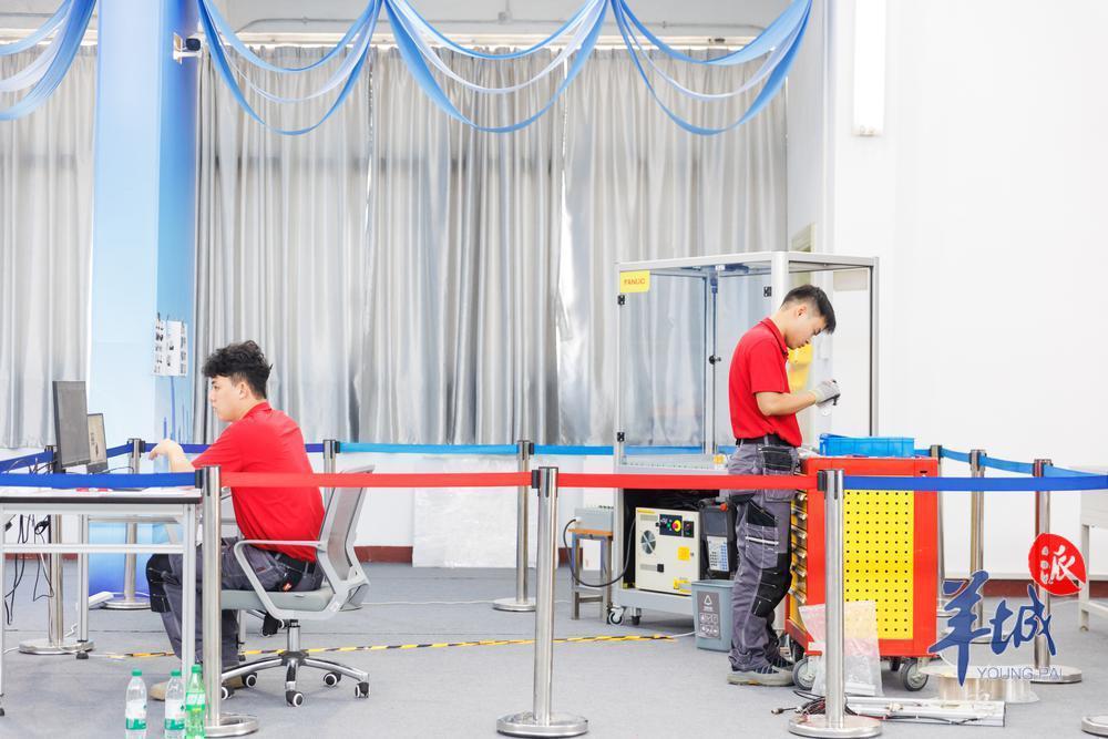 在机器人集成项目训练现场,广东参赛选手吴龙辉和刘富强正在有条不紊地忙碌着。今年 9 月,他们将奔赴法国里昂,代表中国出战世赛。