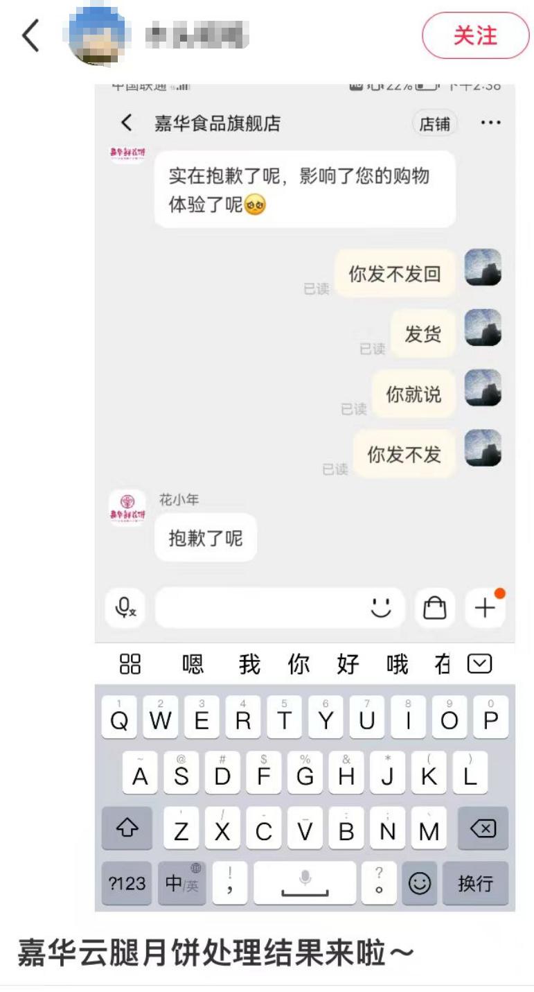 来自广东的一名消费者告诉记者,其于 8 月 21 日凌晨发现嘉华云腿团圆大饼标价为 1 元,随后立即下单了两个。大概一个半小时之后,该商品恢复原价。原本商品预计 21 日发货,但是订单直至 22 日也没有发货,其询问客服也没有得到回应。
