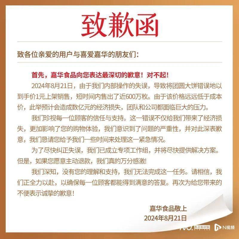 针对此事,8 月 21 日上午,嘉华食品在该款商品的购买页面上发布了《致歉信》称,由于嘉华食品内部操作的失误,导致将团圆大饼错误地以到手价 1 元上架销售,短时间内售出了近 600 万枚。由于该价格远远低于成本价,此举预计会造成数亿元的经济损失,团队和公司都面临巨大的压力。