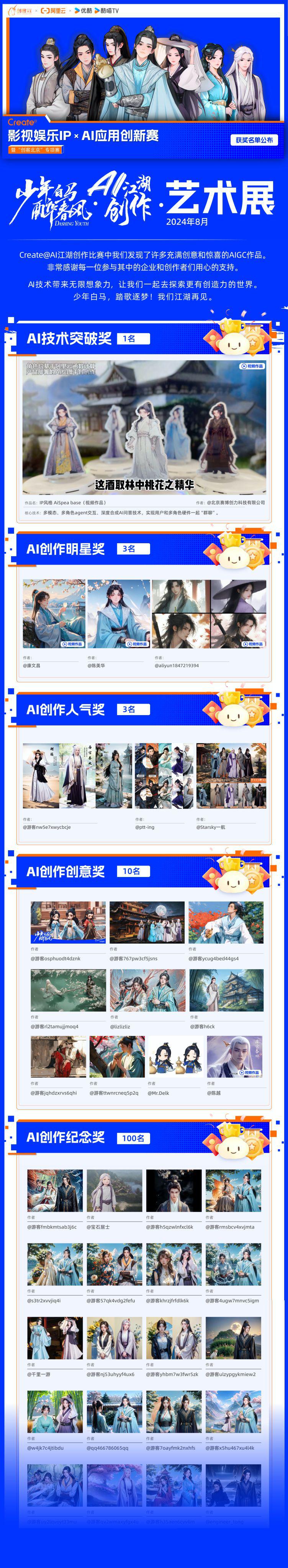 最终,经过由阿里云、优酷、网剧《少年白马醉春风》美术指导团队、外部投资人等组成的专家评委团的评审,以及用户通过官网对喜欢的作品点赞等,北京赛博创力科技有限公司的作品 "IP 风格 AiSpea base" 获得 "AI 技术突破奖 ",康文昌、陈美华等十余位创作者由 AI 技术生成的风格化作品获得 "AI 创作明星奖 "、"AI 创作人气奖 "、"AI 创作创意奖 " 奖项,另外比赛还公布了 100 个 "AI 创作纪念奖 "。更多获奖作品可至大赛官网查看 https://startup.aliyun.com/create/snbm/award