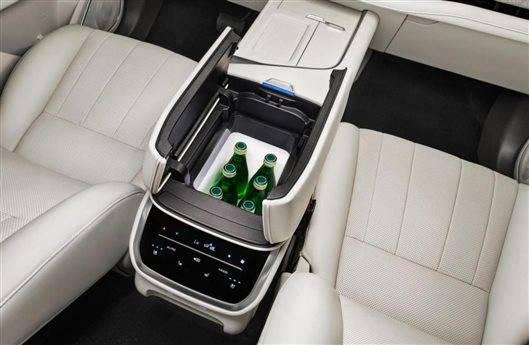 再来看看冰箱,全新蓝山的冰箱位于前排中央扶手处,配备独立压缩机,使其可以拥有更好的制冷 / 制热效果,可以在 -6 ℃ -50 ℃ 超宽温度范围内精准控制,容量为 7L,大概能放下了 6 瓶矿泉水。