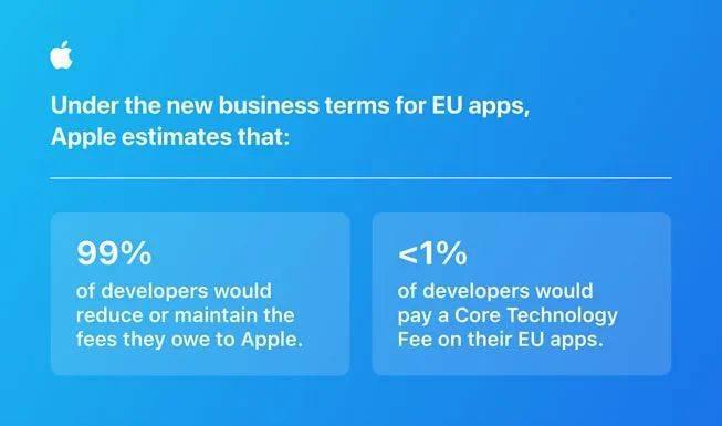 苹果公司表示,在欧盟,将有超过 99% 的开发者降低给苹果的费用,只有不到 1% 的开发者需要支付额外的应用安装费。