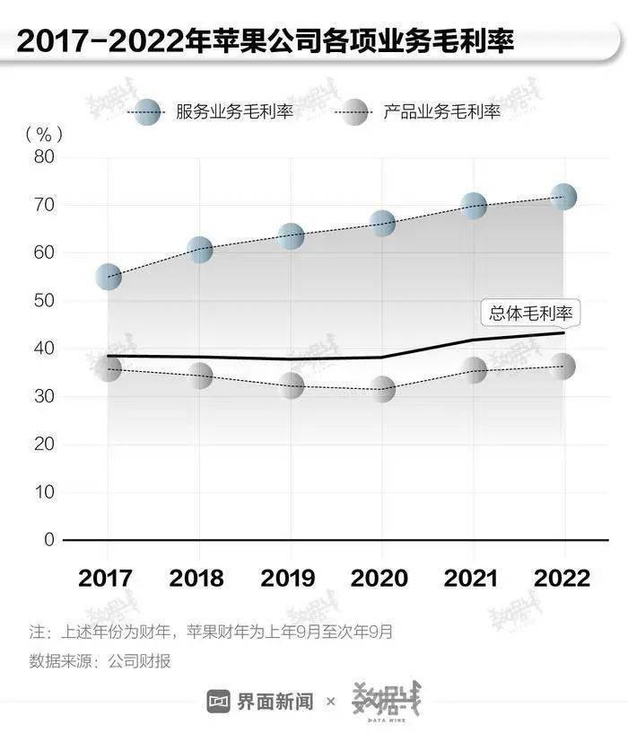 苹果在 WWDC 2023 前夕,公布了 2022 年本公司生态系统的营业与销售额,高达 1.1 万亿美元。截至 2022 财年,苹果公司服务业毛利率为 71.7%,将近是产品业务毛利率的两倍,比公司总体毛利率高出 6 成多。这当中," 苹果税 " ——即 App Store 上所有应用的数字内容消费抽取 15%~30% 的佣金——贡献了大半部分。