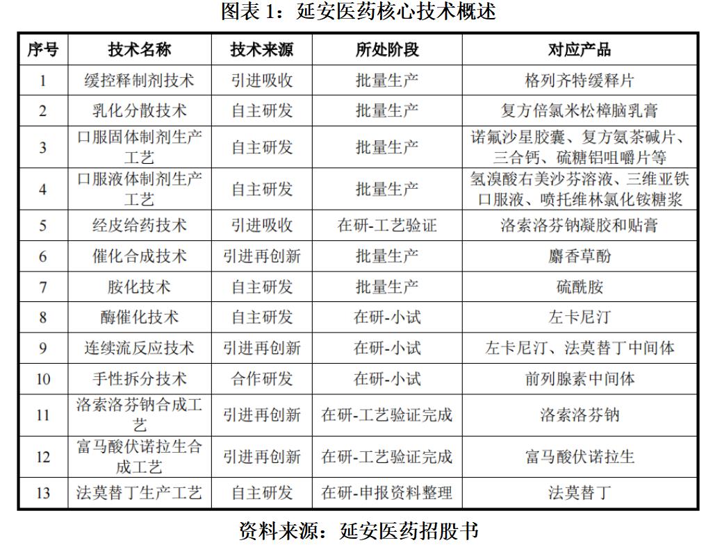 招股书显示,延安医药共计有缓控释制剂技术、乳化分散技术等 13 项核心技术,主要涵盖药品制剂的生产技术和工艺、原料药及中间体的合成工艺和技术。