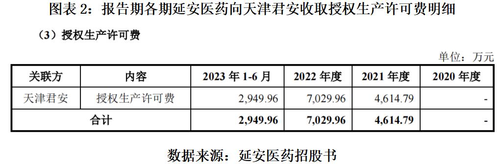 2021 — 2023 年上半年,延安医药向天津君安收取的授权生产许可费收入分别为 4614.79 万元、7029.96 万元、2949.96 万元,授权生产许可费收入对应的销售毛利率在 96% 以上,对应的销售毛利分别为 4463.42 万元、6826.20 万元、2853.50 万元。