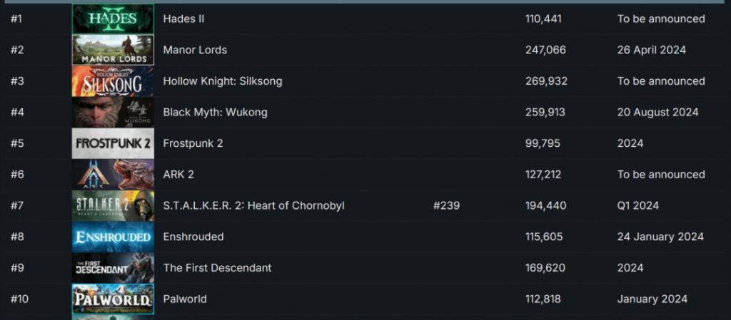 首先是在预热阶段,除了预告片等常规物料外,《幻兽帕鲁》在正式上线前几天,已经开始有部分主播在做一些预热直播,再加上相关的切片短视频传播,《幻兽帕鲁》的前期热度就已不低。SteamDB 数据显示,《幻兽帕鲁》正式发售前一周,便在 Steam 愿望单上挤进前十位。