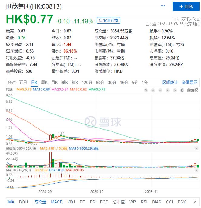 二级市场方面,截至 11 月 24 日收盘,世茂集团市值仅剩 29.24 亿港元。而 A 股上市公司世茂股份总市值 48.77 亿元,股价仍在 1 元附近游走。