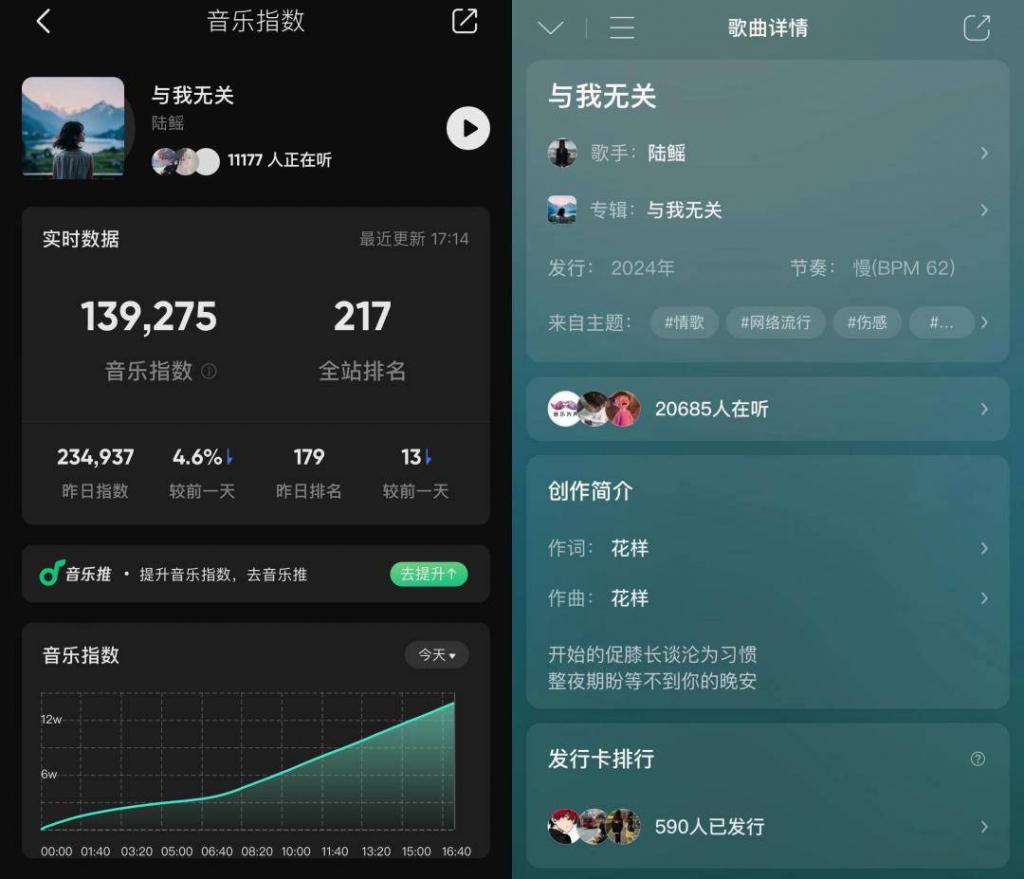 然而,在正版《与我无关》翻红约半个月后,洗歌版本悄然上线,演唱者就是前面提到的陆鳐,词曲作者为花样。