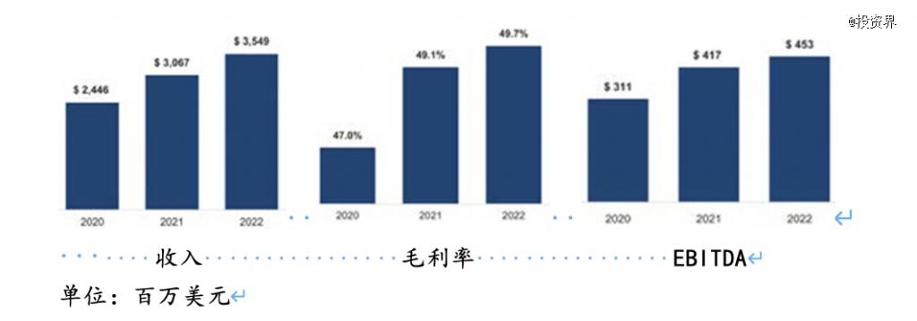 最为直观的成绩,正如前面招股书中提到的,2020 年到 2022 年,亚玛芬体育的收入从 24 亿美元增加到 35 亿美元,复合年增长率达 20.4%,毛利率从 47.0% 增至 49.7%。