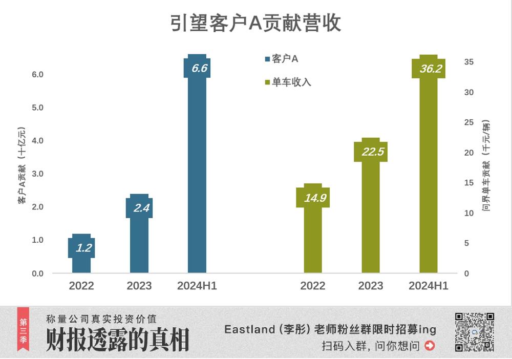 五大客户中占比最高的 " 客户 A",非赛力斯莫属。2024 年 H1 贡献营收 66 亿、占引望营收的 63.4%(2023 年这个比例为 51%)。