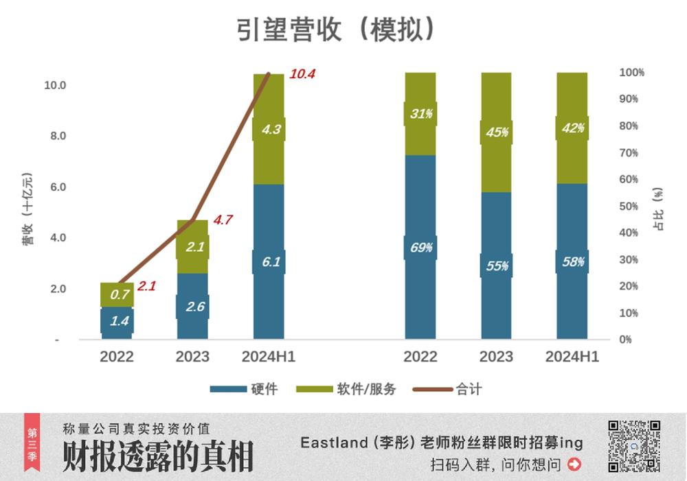 2024 年 H1,引望营收 104 亿。其中硬件 61 亿、占比 58.4%;软件 / 服务 43.4 亿、占比 41.6%;