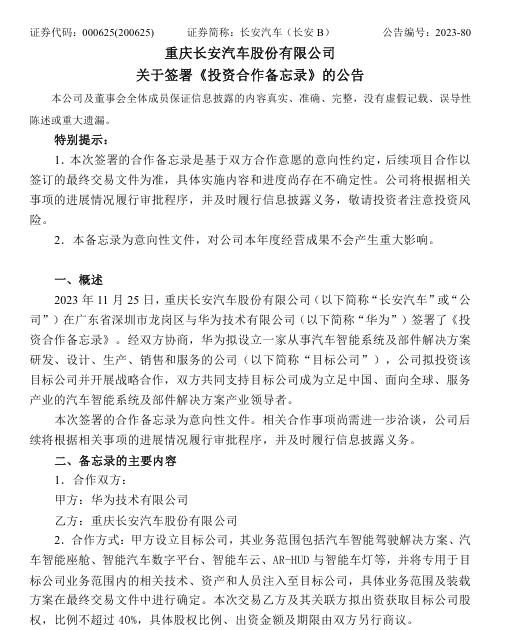 2023 年 11 月 25 日,华为与长安汽车(000625.SZ)签署《投资合作备忘录》,要点如下: