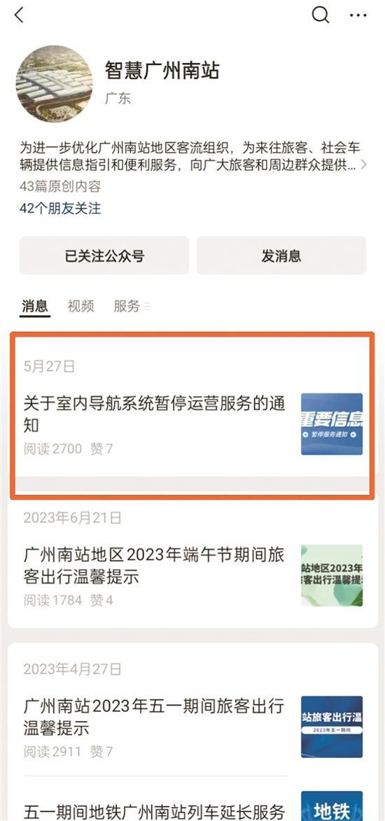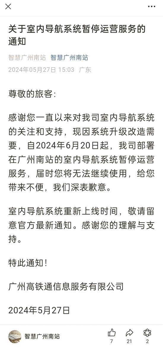不过,广州南站站内导航系统已于今年 6 月 20 日起正式暂停运营服务。" 智慧广州南站 " 微信公众号,在今年 5 月 27 日发布推文披露了上述消息。虽然该公众号定位是 " 向广大旅客和周边群众提供智能化、现代化服务的南站服务平台 ",但从推文更新情况看,基本处于暂停更新状态。2024 年到目前为止,仅发布了上述一条推文。通过该公众号查询 " 停车场及收费标准 ",得到的回复内容却堪称 " 陈年旧事 ",小车每小时收费还停留在 4 元 / 小时。