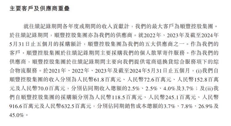 招股书显示,2021 年、2022 年、2023 年及截至 2024 年 5 月 31 日止五个月,丰巢自顺丰处获得的收入分别为 6180 万元、7260 万元、1.53 亿元及 7000 万元,占同期收入总额的 2.5%、2.5%、4.0% 及 3.7%;向顺丰支付的采购额则分别为 1.19 亿元、2.45 亿元、9.17 亿元和 6.33 亿元,占同期销售成本总额的 3.7%、7.8%、26.9% 和 45.0%。