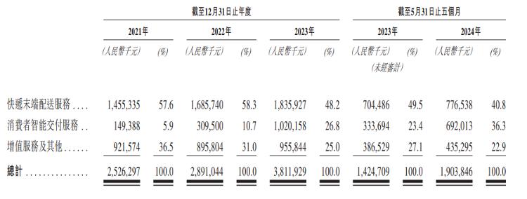 数据显示,2021 年、2022 年、2023 年及截至 2024 年 5 月 31 日止 5 个月,丰巢的增值服务收入分别为 9.22 亿元、8.96 亿元、9.56 亿元和 4.35 亿元,占同期总收入的比重分别为 36.5%、31%、25% 及 22.9%。
