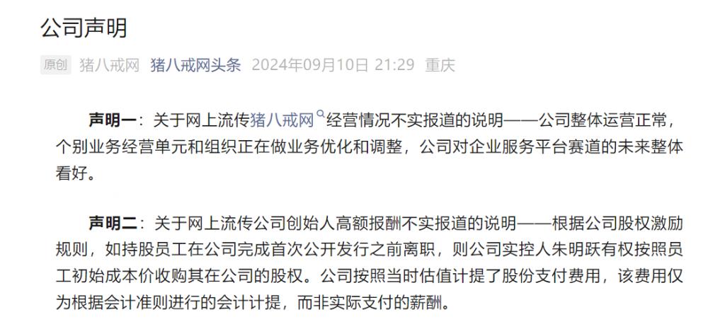 9 月 10 日晚间,针对近期关于猪八戒股份有限公司(以下简称猪八戒网)欠薪等经营情况的报道," 猪八戒网头条 " 微信号发表声明称,公司整体运营正常,个别业务经营单元和组织正在做业务优化和调整,同时网上流传的猪八戒网经营情况和公司创始人高额报酬相关报道均不实。