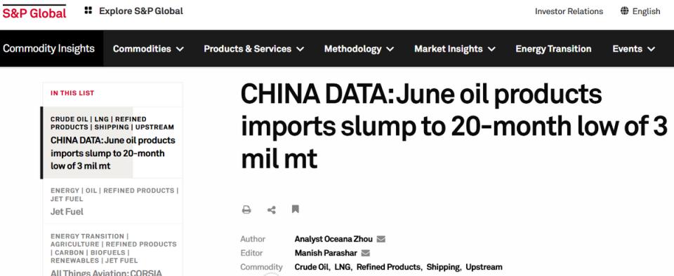 根据第三方机构 Platts 的数据,今年来中国石油产品采购量降至 20 个月低点。BOK Financial Securities 高级副总裁 Denis Kissler 表示,中国需求疲软是国际油价下跌的主要原因。现在全球石油市场都在考虑整个亚洲的前景,亚洲国家是否会购买生产国所依赖的数量的石油。
