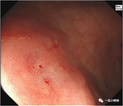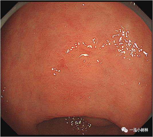 图1a 白光内镜:胃窦小弯可见IIa+IIc病变,范围2.0cmx1.5cm,微发黄,似胃炎样外观,边界线可疑。