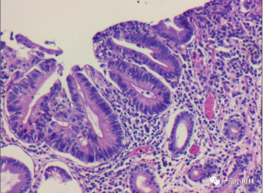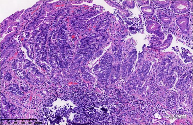图1e 病理组织学:术后ESD病理:细胞核大深染,呈假复层排列,腺管排列紊乱,高分化腺癌(Tub1)。