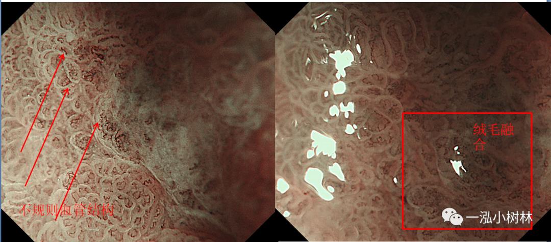 图7 ME-NBI:不规则绒毛结构+不规则微血管结构+绒毛融合