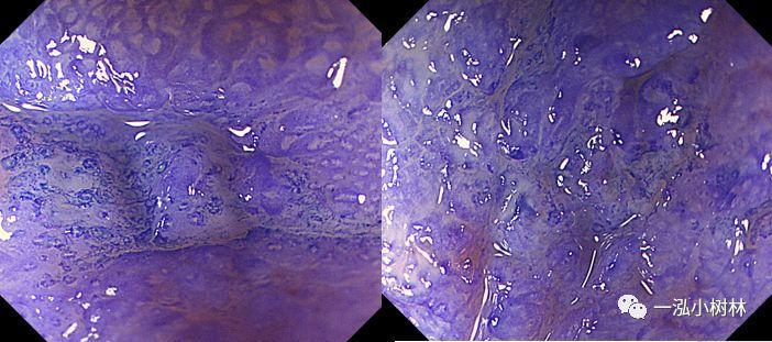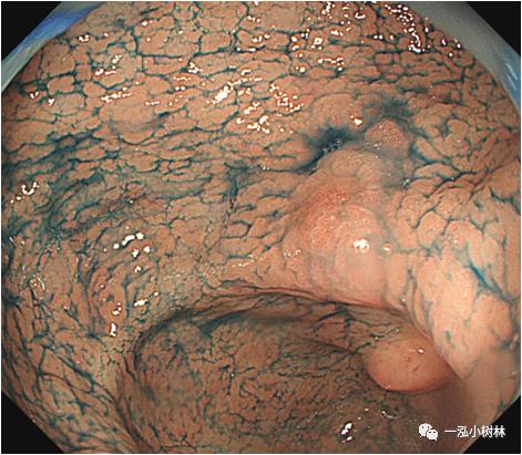 图1b 色素内镜:喷洒靛胭脂后可见病变边界清晰,病变处胃小区及胃小沟消失,病变处发红,靛胭脂不着色。