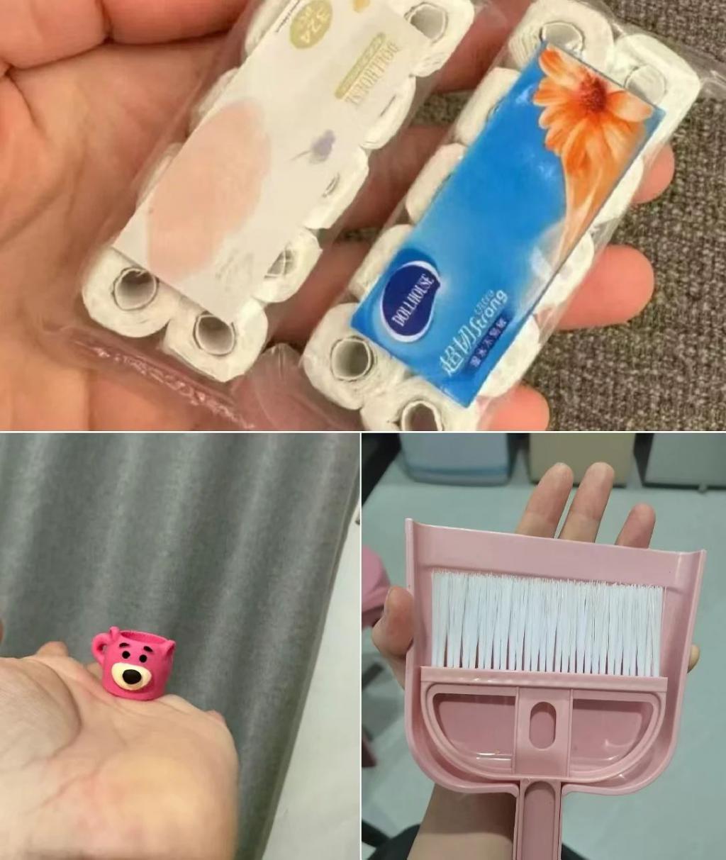消费者们遇到的 " 小人国用品 " 五花八门。有人网购的扫把和簸箕只比手掌略大,对联小到只能贴在手机壳上,茶几小到只能摆放潮玩,还有人花 9.9 元购买的凳子、桌子只收到模型,花 15.8 元购买的台灯底座只有瓶盖大小,花 1 元抢购的矿泉水可以在掌心放下 10 瓶 ……