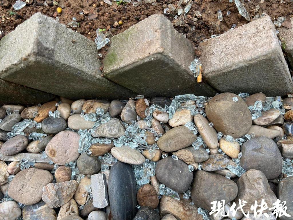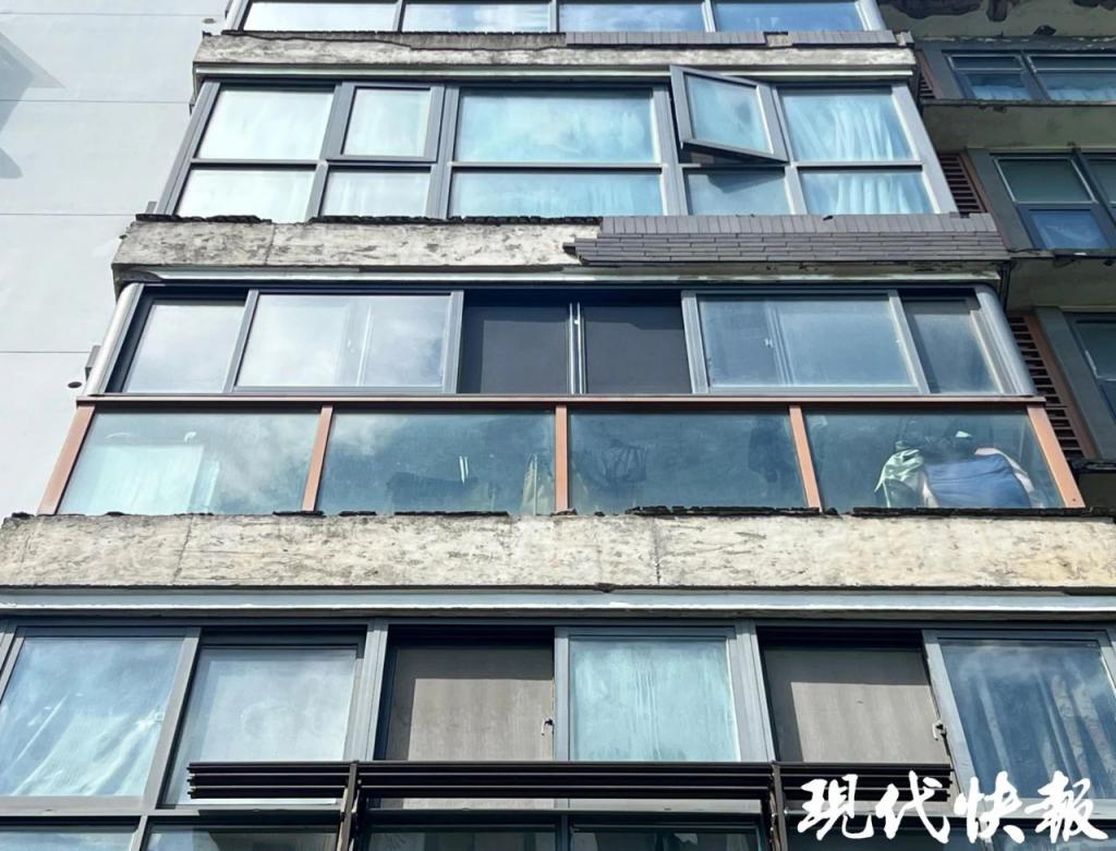 9 月 18 日,现代快报记者在现场看到,王先生安装的钢化玻璃,部分已被楼上掉落的水泥块砸穿,地上还散落着玻璃碴。站在楼下抬眼望去,可以清楚看到居民楼外墙水泥块脱落后的痕迹,有些区域原本应埋在水泥深处的钢筋,也已经裸露在外。王先生告诉记者,刚开始他装的是单层的钢化玻璃,后来换成了双层的,但偶尔也会被砸穿。