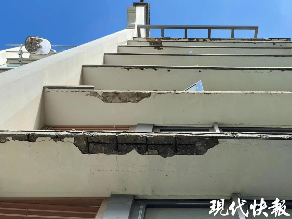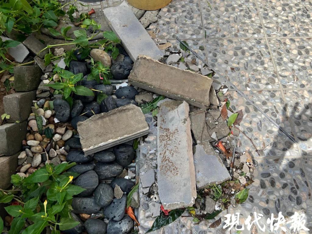 据了解,该小区分小高层和联排别墅,共计 33 幢居民楼、543 户业主。现代快报记者走访发现,除王先生所在的 24 幢之外,其余楼幢也多有装饰砖块、水泥块、瓦片脱落的情况,有些区域甚至是成片脱落。" 这么大块的水泥,从七八楼的高度掉下来,幸亏是没有砸到人,不然后果真是不敢想象!" 王先生坦言,自己曾多次拨打 12345 热线反映情况,但问题迟迟未得到解决。