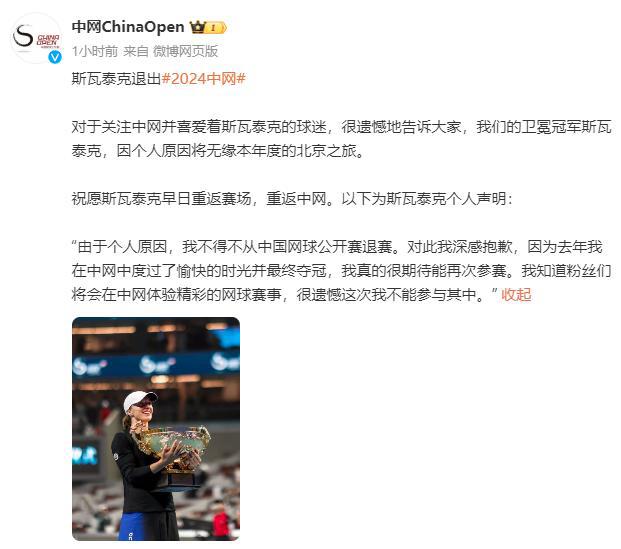 9 月 20 日,@中网 ChinaOpen 发布斯瓦泰克退出 2024 中国网球公开赛的消息 @中网 ChinaOpen 表示: