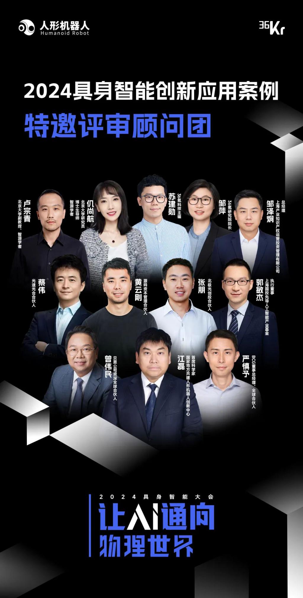 为切实保证此次评选的中立性、权威性与严谨性,我们特邀 12 位来自不同领域的专业人士组成超级评审团,涵盖行业科学家、咨询专家、资深投资人以及知名媒体人,具体包括国家地方共建人形机器人创新中心首席科学家江磊、贝恩公司资深全球合伙人曾伟民、波士顿咨询(BCG)董事总经理 / 全球合伙人严慎予、源码资本管理合伙人黄云刚、北极光创投合伙人张朋、光速光合的合伙人蔡伟、上海国投先导人工智能产业基金执行董事郭敏杰、北京大学副教授 / 智源学者卢宗青、北京大学计算机学院研究员 / 博士生导师 / 博雅青年学者仉尚航、上海产业知识产权运营投资管理有限公司总经理邹泽炯、36 氪科技主编苏建勋、36 氪研究院院长邹萍。