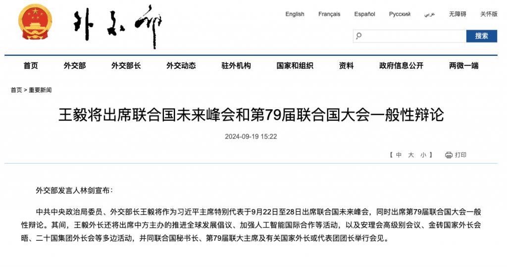 中国外交部发言人林剑上周宣布,中共中央政治局委员、外交部长王毅将作为习近平主席特别代表于 9 月 22 日至 28 日出席联合国未来峰会,同时出席第 79 届联合国大会一般性辩论。