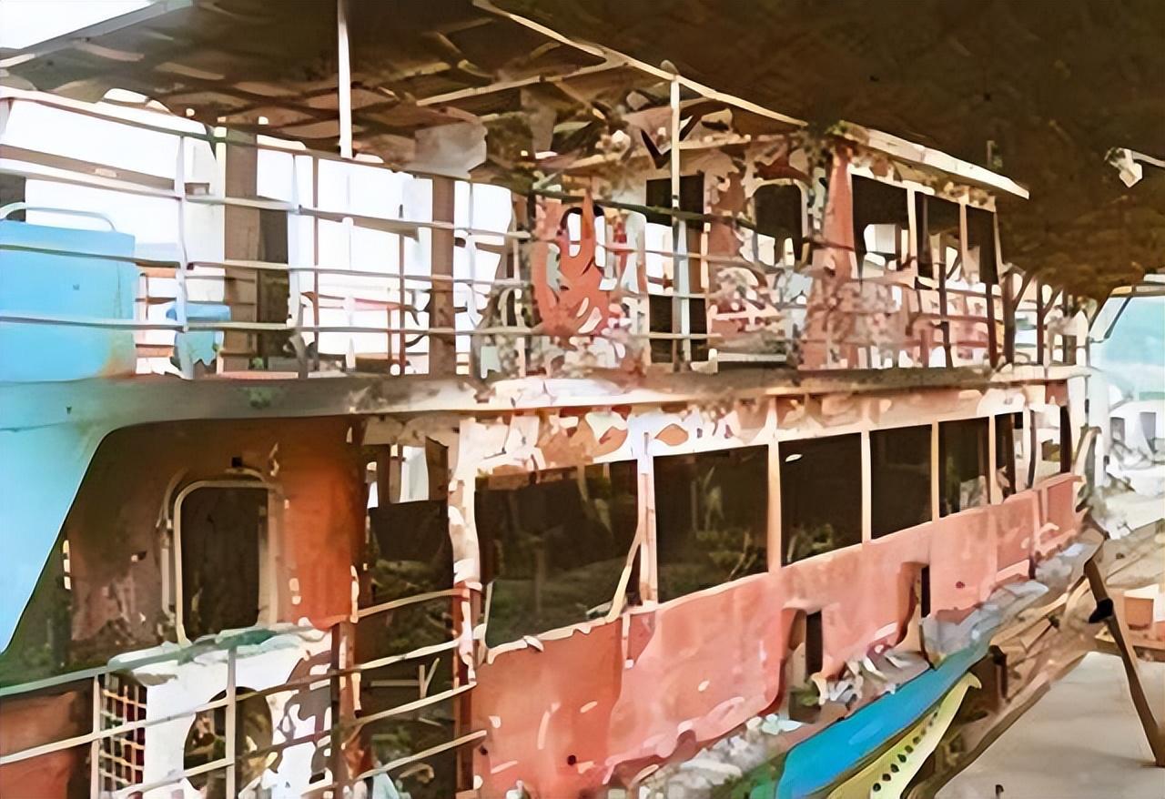 而此时的游船已经被烧的只剩下钢制船体。