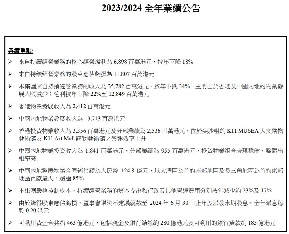 2024 财年(2023 年 7 月 1 日 ~2024 年 6 月 30 日),新世界发展股东应占亏损约 196.83 亿港元,这也是新世界发展近 20 个财年以来首次出现亏损;来自持续经营业务的收入约为 357.82 亿港元,同比下跌 34%;来自持续经营业务的核心经营溢利为 68.98 亿港元,同比下跌 18%。