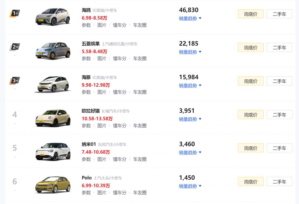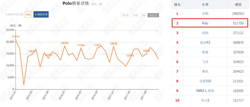 国内的小型车基本是海鸥、缤果、海豚三分天下, Polo 虽然排名第 6 ,但销量和第一名的海鸥差了足足 30 几倍。