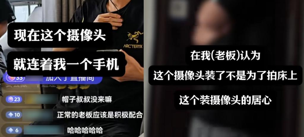 在博主发布的视频里,你可以听到这位老板的以下发言: " 这有人动了是吧? " , " 现在这个摄像头,就连着我一个手机 ( 这里似乎是口误,本来想说路由器之类) " , " 这个摄像头装了不是为了拍床上 " 。