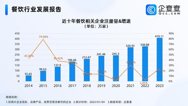 据企查查数据,最近十年,我国餐饮相关企业注册量呈持续正增长态势,且年年新高。2021 年、2022 年、2023 年我国餐饮相关企业注册量分别超过 320 万家、330 万家、410 万家。