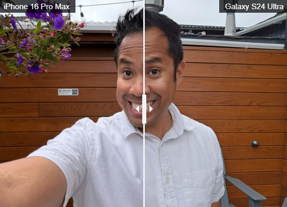 前置摄像头方面,iPhone 拥有更宽广的视野,适合地面拍摄;而 S24 Ultra 则在面部细节和清晰度上表现更佳。低光环境下,iPhone 16 Pro Max 不仅能照亮整个场景,还能捕捉到更锐利的细节。