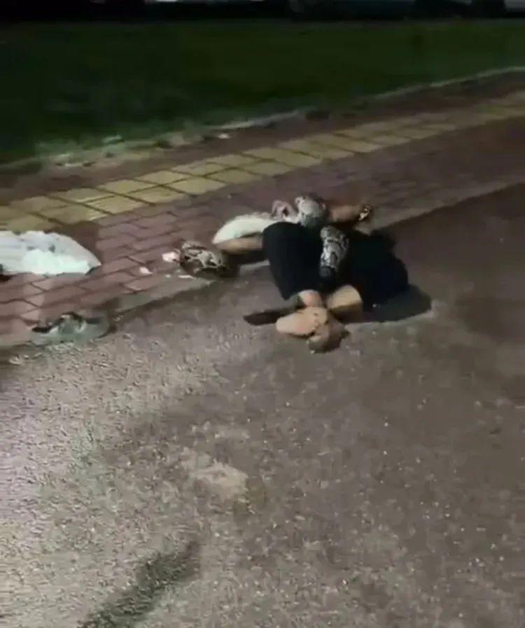 9 月 28 日晚 9 时许,惠州市惠城区春江紫宸小区一名穿着黑裤,光着脚的男子倒在地上,身体被一条蟒蛇死死缠住,动弹不得。