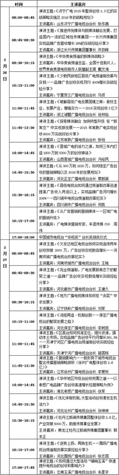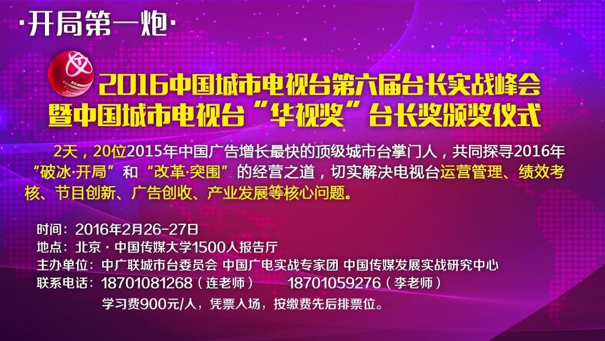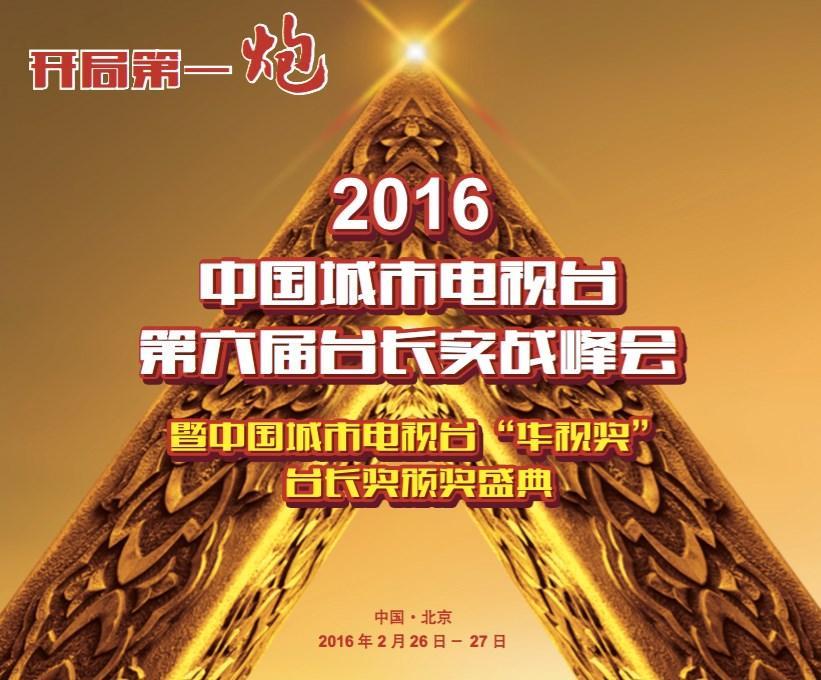 由中广联城市台委员会、中国广电实战专家团、中国传媒发展实战研究中心联合主办的“2016·中国城市电视台第六届台长实战峰会暨中国城市电视台‘华视奖’台长奖颁奖仪式”将于2016年2月26日-27日开幕,全国来自江苏、山东、浙江、河北、河南、四川、黑龙江、山西、辽宁、天津、湖北、宁夏、云南等2015年中国广告增长最快的二十余位顶级城市台、县(区)台掌门人齐聚北京,共同探寻2016城市电视台开年“破冰、开局”和“改革、突围”的经营之道。