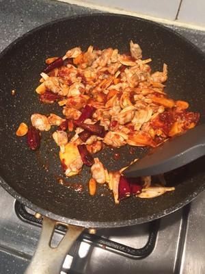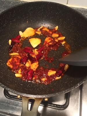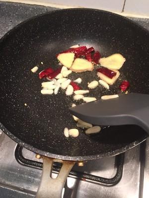 8、锅里热油,放入姜、蒜和干辣椒炒香;