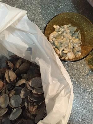 费时间的来了,捞出的花蛤,一个一个从壳里剥出来,每个都在流水下扒开清洗,你会发现即使吐过沙焯过水里面依然很脏,我买了两斤,至少有五六只寄居蟹,其中俩大的还带籽儿……全掏出洗净后再清洗至少三遍,还有脏东西出来……之后沥干水备用。