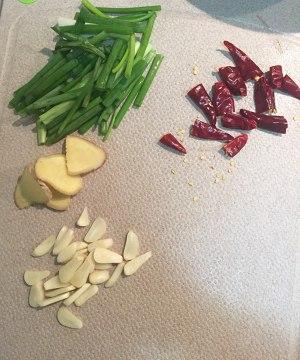 7、香葱切段,姜切片,蒜切片,干辣椒切段;