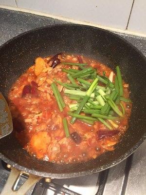 12、烧开翻匀后放入香葱翻炒,然后快速加入水淀粉勾芡出锅;